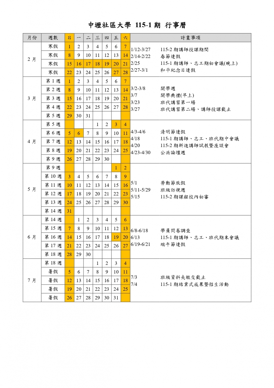 中壢社區大學行事曆